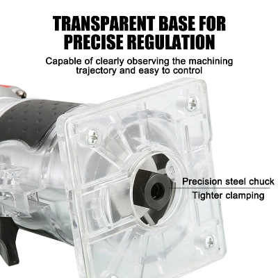 Providna baza alata je dizajnirana za maksimalnu vidljivost radne povrsine, što vam omogućava da pratite putanju glodala u realnom vremenu i osigurate izuzetnu preciznost. Čvrsta celicna caura sa prihvatom 6.35 mm(1/4 incˇa) obezbeđuje sigurno stezanje, kompatibilno sa najčešćim setovima glodala na tržištu.