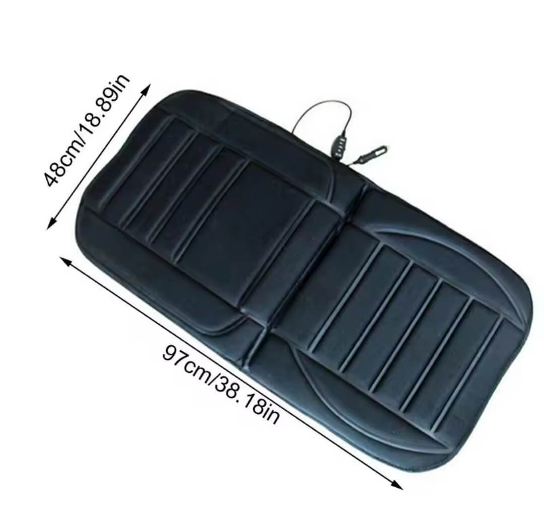 Materijal: Crni poliester otporan na vlaznost i ostecenja, sa elasticnim rubovima za cvrsto pridržavanje. Napajanje: 12V DC iz upaljaca vozila, sa kablom duzine 2 metra. Dimenzije: 97 cm (duzina) x 48 cm (sirina), pokriva sedalni deo i naslon. Zagrevanje: Brzo pokretanje u 2-3 minuta, tri stepena temperature sa LED signalima. Kontrola: Integrisani prekidac sa dugmicima za pokretanje i podesavanje. Montaža: Bez alata, elasticne trake i kuke za univerzalnu primenu. Sigurnost: Automatsko iskljucivanje posle 45 minuta, zastita od preopterecenja. Upotreba: Odgovara prednjim sedistima, radi sa koznim i platnenim presvlakama. Tezina: Priblizno 1.5 kg, lako se cuva van sezone. Boja: Crna, nenametljiva i stilizovana.