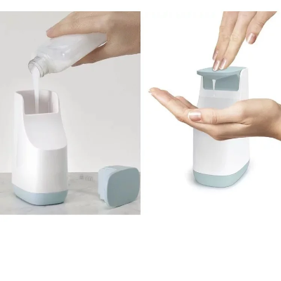 Ovaj moderni dozer ističe se i svojim ergonomskim dizajnom. Sa blagim pritiskom dlana na gornju površinu, dobijate idealnu količinu sapuna, što obezbeđuje optimalnu higijenu bez dodirivanja celog tela dozera prljavim rukama. Njegova stabilna baza, u nežnoj svetloplavoj nijansi, garantuje da će čvrsto stajati na bilo kojoj površini, bilo da je to umivaonik u kupatilu ili radna ploča u kuhinji.