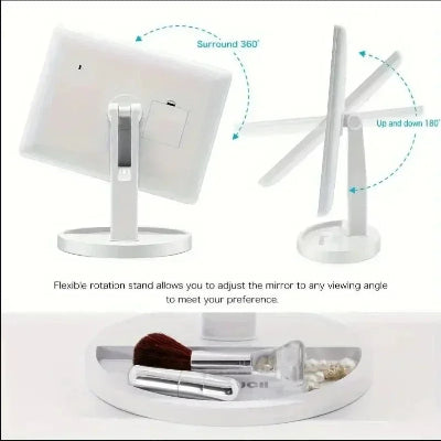 Dizajniran sa fleksibilnim rotacionim postoljem, ovo ogledalo nudi potpunu slobodu pokreta. Mozete ga rotirati za 180 stepeni vertikalno i 360 stepeni horizontalno, omogucavajuci vam da pronadjete savrsen ugao gledanja za svaku aktivnost. Stabilno postolje, pored funkcionalnosti, sadrzi i prakticnu pregradu za sitnice, idealnu za cuvanje cetkica, nakita ili manjih kozmetickih proizvoda.