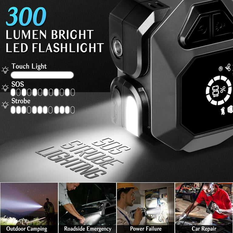 Sa snažnim Jump Starterom, možete brzo pokrenuti vaš automobil, a ugrađeni kompresor vam omogućava da naduvate gume, lopte ili druge predmete. Uređaj takođe dolazi sa dodatnim priborom kao što su rukavice, krpa i torbica za nošenje.