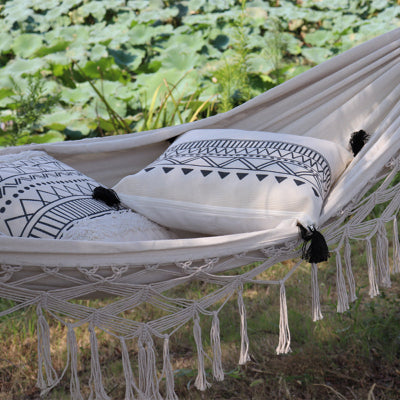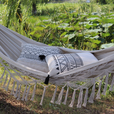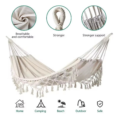 Ova viseća ležaljka je vaš savršen saputnik za opuštanje, bilo da ste u prirodi, na putovanju ili u udobnosti svog doma. Napravljena od kvalitetnog i prozračnog materijala, pruža izuzetnu udobnost tokom letnjih dana. Zahvaljujući elegantnom boho stilu sa resama i čvrstom tkanju, ležaljka se lako uklapa u bilo koji enterijer ili eksterijer, stvarajući opuštajuću atmosferu. Bez obzira da li je koristite na balkonu, u dvorištu ili u dnevnoj sobi, ova ležaljka je savršen kutak za čitanje knjige, spavanje ili jednostavno odmaranje.