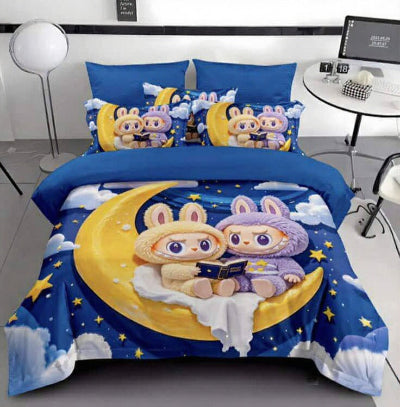 Uronite u svet snova uz carobnu deciju posteljinu koja donosi zvezdano nebo pravo u deciju sobu! Predstavljamo posteljinu sa neodoljivim motivom: dva slatka zeca (jedan u zutom, drugi u ljubicastom plišanom odelu) sede na velikom, zlatnom mesecu, okruženi zvezdama i oblacima.